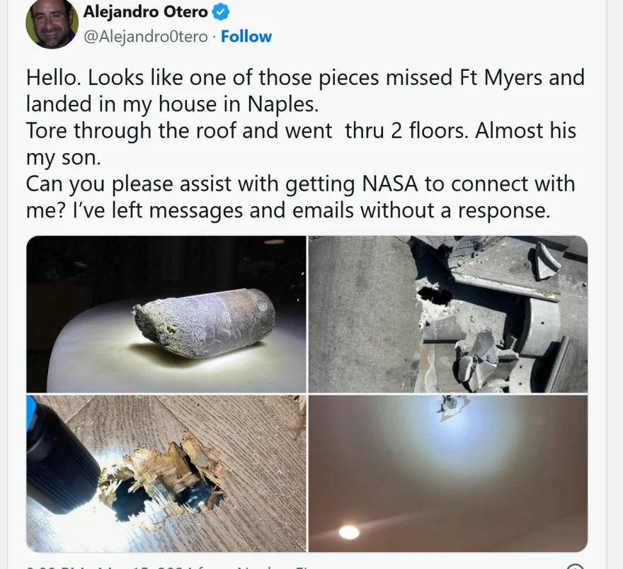 NASA confirms mystery object that crashed through roof of Florida home came from space stationhttps://t.co/CEFBJvgmDg pic.twitter.com/uz0wbi0CFw