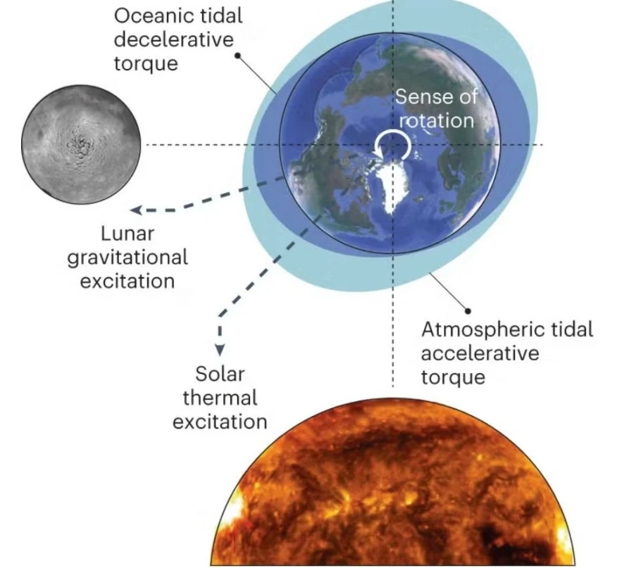 Εκτός από τις ωκεάνιες παλίρροιες που προκαλεί η Σελήνη και επιβραδύνουν τη Γη, η ηλιακή ακτινοβολία θερμαίνει την ατμόσφαιρα και δημιουργεί ηλιακές ατμοσφαιρικές παλίρροιες. Αυτές, σε αντίθεση με τις σεληνιακές, τείνουν να επιταχύνουν την περιστροφή του πλανήτη.