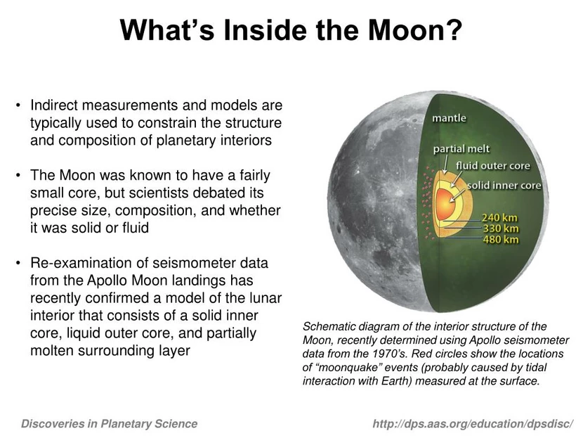 Σύμφωνα με το πρώτο σενάριο, το εσωτερικό της Σελήνης είναι καυτό και ένα μικρό μέρος του έχει λιώσει, σχηματίζοντας ένα παχύ στρώμα αδύναμων υλικών θαμμένα κάτω από 1.000 χιλιόμετρα από την επιφάνεια.