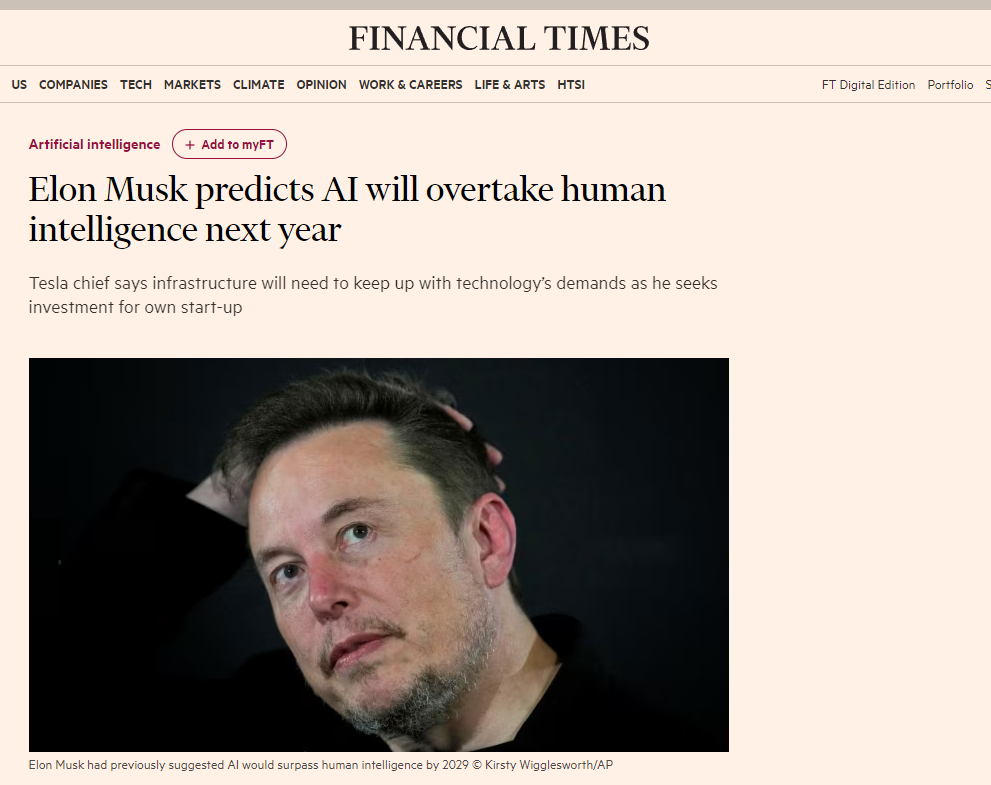 Ο Έλον Μασκ, κατά τη διάρκεια συνέντευξής του, δήλωσε πως μέχρι το τέλος του επόμενου έτους η ικανότητα των νέων μοντέλων τεχνητής νοημοσύνης θα ξεπεράσει την ανθρώπινη.