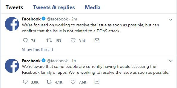 Το Facebook ανακοίνωσε μέσω Twitter πως γνωρίζει το πρόβλημα και πως προσπαθεί να το επιλύσει. Πρόσθεσε επίσης πως το πρόβλημα δεν έχει προκληθεί από κάποια επίθεση DDoS.