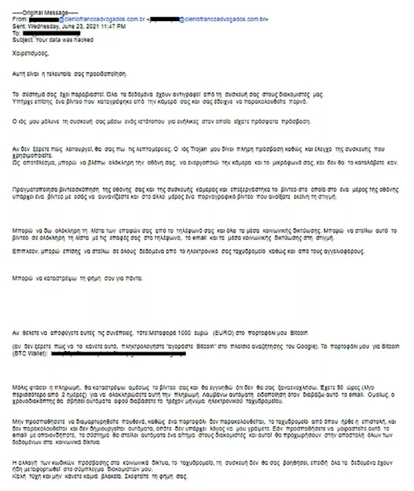 Η Διεύθυνση Δίωξης Ηλεκτρονικού Εγκλήματος, προειδοποιεί τους χρήστες ηλεκτρικού ταχυδρομείου να αγνοούν και να μην ανοίγουν email στα οποία υπάρχει ελληνικό κείμενο με θέμα «Your data was hacked» ή «Open and read this letter».