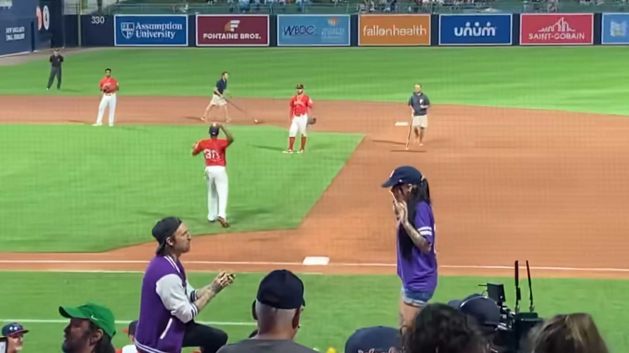 Το συμβάν έλαβε χώρα σε αγώνα των Worcester Red Sox στο Γουόρσεστερ της Μασαχουσέτης, με τον άνδρα να γονατίζει μπροστά στην κοπέλα του με το δαχτυλίδι, αλλά εκείνη να αντιδρά μη αναμενόμενα και να τον σοκάρει.