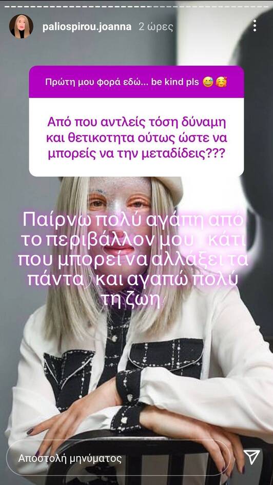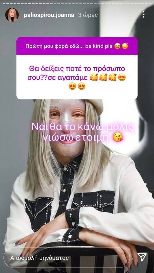Η Ιωάννα Παλιοσπύρου απάντησε και στην ερώτηση «Θα δείξεις ποτέ το πρόσωπό σου; Σε αγαπάμε», λέγοντας ότι: «Ναι, θα το κάνω μόλις νιώσω έτοιμη».