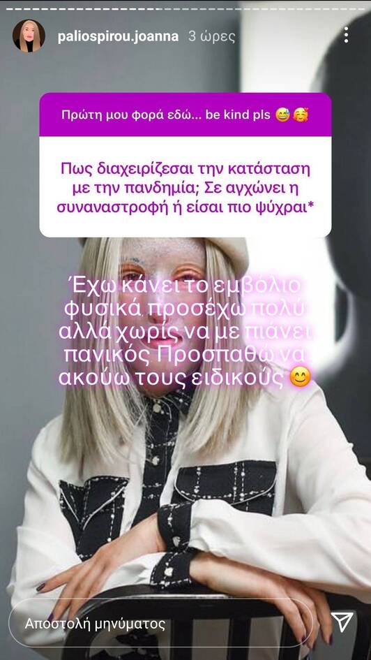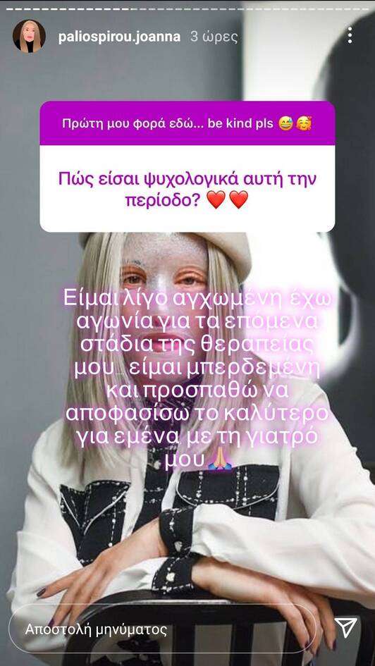 Μια άλλη ερώτηση που δέχτηκε έλεγε: «Πώς είσαι ψυχολογικά αυτή την περίοδο;». Με την Ιωάννα Παλιοσπύρου να απαντά: «Είμαι λίγο αγχωμένη. Έχω αγωνία για τα επόμενα στάδια της θεραπείας μου. Είμαι μπερδεμένη και προσπαθώ να αποφασίσω το καλύτερο για εμένα με τη γιατρό μου».