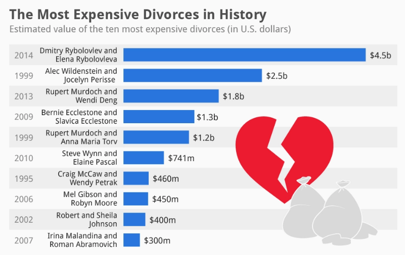 To ρεκόρ του ακριβότερου διαζυγίου μέχρι στιγμής πάντως στον επιχειρηματικό κόσμο κατέχει αναμφίβολα ο Ρώσος επιχειρηματίας – αλλά και ιδιοκτήτης του Σκορπιού – Dmitry Rybolovlev, καθώς εκτιμάται πως το διαζύγιο του από τη σύζυγό του Elena το 2014 κόστισε 4,5 δισεκατομμύρια δολάρια. Το δε πιο ακριβό διαζύγιο στον καλλιτεχνικό χώρο ήταν αυτό του Mel Gibson από την Robyn Moore που κόστισε όμως μόλις 450 εκατομμύρια δολάρια.
