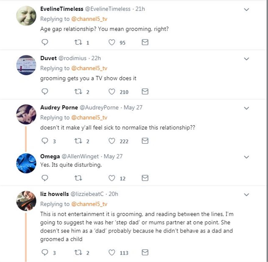 «Είναι τρελό που το προβάλλετε αυτό. Είναι απαράδεκτο να εμφανίζετε ως φυσιολογική τη συμπεριφορά μεσήλικων «αρπακτικών» και να παρουσιάζετε την ανάρμοστη σχέση τους με ανήλικα κορίτσια ως ρομαντική ιστορία», έγραψε ένας χρήστης. Δεκάδες άλλοι επισήμαναν εξοργισμένοι ότι πρόκειται για μια ξεκάθαρη περίπτωση αποπλάνησης ανηλίκου.