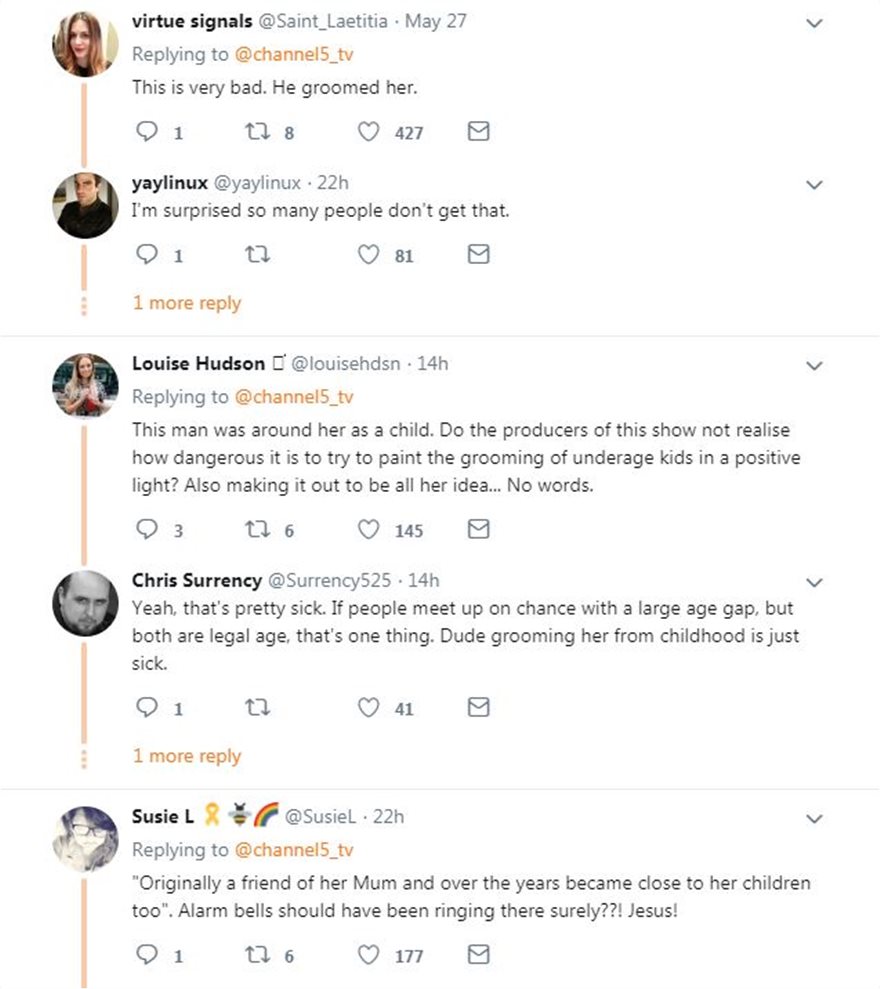 «Είναι τρελό που το προβάλλετε αυτό. Είναι απαράδεκτο να εμφανίζετε ως φυσιολογική τη συμπεριφορά μεσήλικων «αρπακτικών» και να παρουσιάζετε την ανάρμοστη σχέση τους με ανήλικα κορίτσια ως ρομαντική ιστορία», έγραψε ένας χρήστης. Δεκάδες άλλοι επισήμαναν εξοργισμένοι ότι πρόκειται για μια ξεκάθαρη περίπτωση αποπλάνησης ανηλίκου.