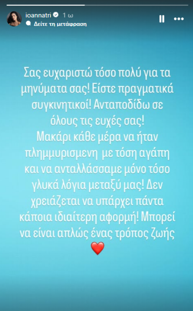 Μέσα από μια ανάρτηση στον προσωπικό της λογαριασμό στο Instagram, η Ιωάννα Τριανταφυλλίδου έσπευσε να ευχαριστήσει τους διαδικτυακούς της ακόλουθους για τις ευχές που της έστειλαν, χαρακτηρίζοντάς του «συγκινητικούς».