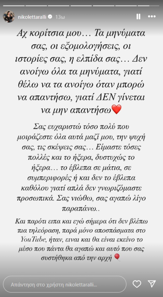 «Αχ κορίτσια μου… Τα μηνύματά σας, οι εξομολογήσεις, οι ιστορίες σας, η ελπίδα σας… Δεν ανοίγω όλα τα μηνύματα, γιατί θέλω να τα ανοίγω όταν μπορώ να απαντήσω, γιατί δεν γίνεται να μην απαντήσω».