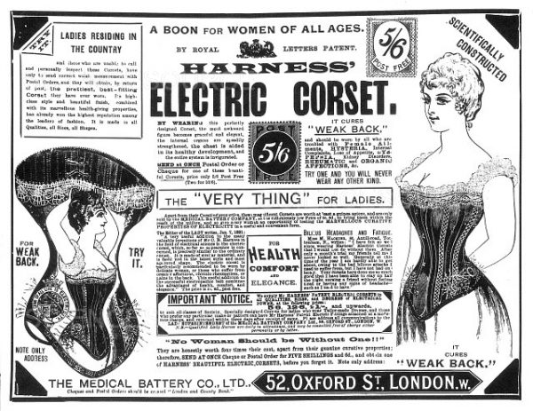 Έτσι και αλλιώς ο κορσές εκείνη την εποχή ήταν ένα βασανιστήριο, αλλά φανταστείτε να έχει ρεύμα. Υπόσχονταν από κάψιμο λίπους, έχρι και ανόρθωση στήθους, ακόμα και λύση στη δυσκοιλίοτητα.