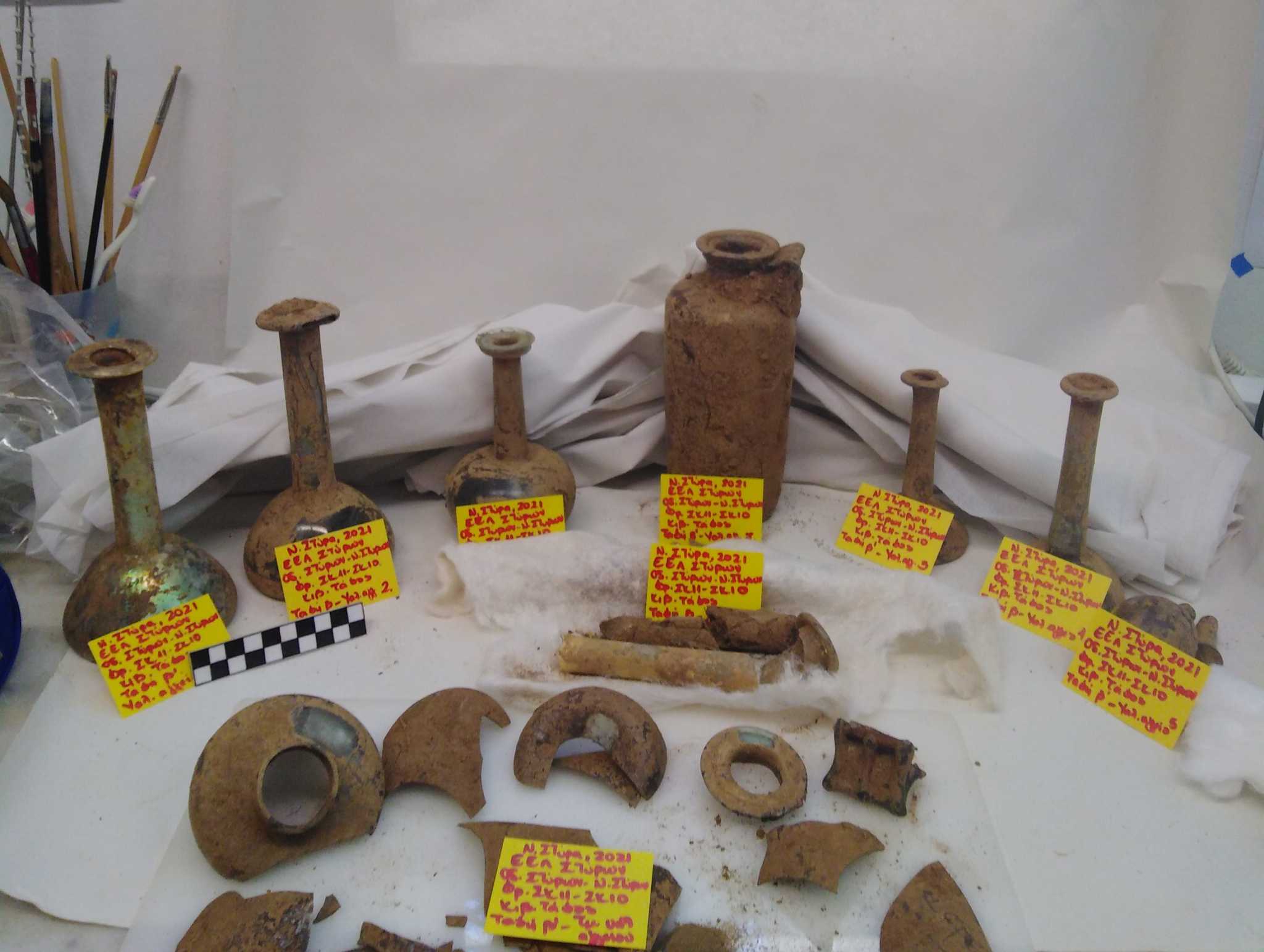 (κάλαθος), χάλκινο δισκάριο με διαμπερείς οπές περιμετρικά και 6 υάλινα αγγεία με κωνικό και σφαιρικό σώμα.