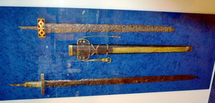 Ένα από τα ξίφη, που ανακαλύφθηκε το 1993 στα ερείπια μιας εκκλησίας, μπορεί να είχε τοποθετηθεί εκεί ως προσφορά. Τα όπλα που τοποθετούνταν στις εκκλησίες, εξήγησε ο Μανιώτης, συνδέονταν συνήθως με λείψανα αγίων πολεμιστών. Αυτό το ξίφος είχε ένα σταυρό, ένα κομμάτι μετάλλου κάθετο στη λεπίδα.