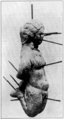 Πήλινο ομοίωμα γυναίκας που χρησιμοποιήθηκε σε ερωτική μαγεία, με καρφιά σε διάφορα όργανά του σώματός της (Μουσείο Λούβρου)