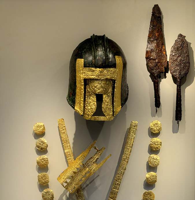 Περισσότεροι από 500 θησαυροί της μακεδονικής γης, ευρήματα της αρχαιολογικής έρευνας των τελευταίων 25 χρόνων, ανάμεσά τους χρυσά στεφάνια, χρυσές μάσκες, κοσμήματα, χρυσοποίκιλτα όπλα, μοναδικά γλυπτά, μετάλλινα, αλαβάστρινα και πήλινα αγγεία και πολλά ακόμη ευρήματα από τις πολύχρυσες νεκροπόλεις των Αιγών και του Αρχοντικού που ήταν ο προκάτοχος της Πέλλας στα αρχαϊκά χρόνια (7ος-6ος αι. π.Χ.) παρουσιάζονται για πρώτη φορά στο ελληνικό κοινό σε μεγάλη περιοδική έκθεση στο νέο Αρχαιολογικό Μουσείο της Πέλλας.