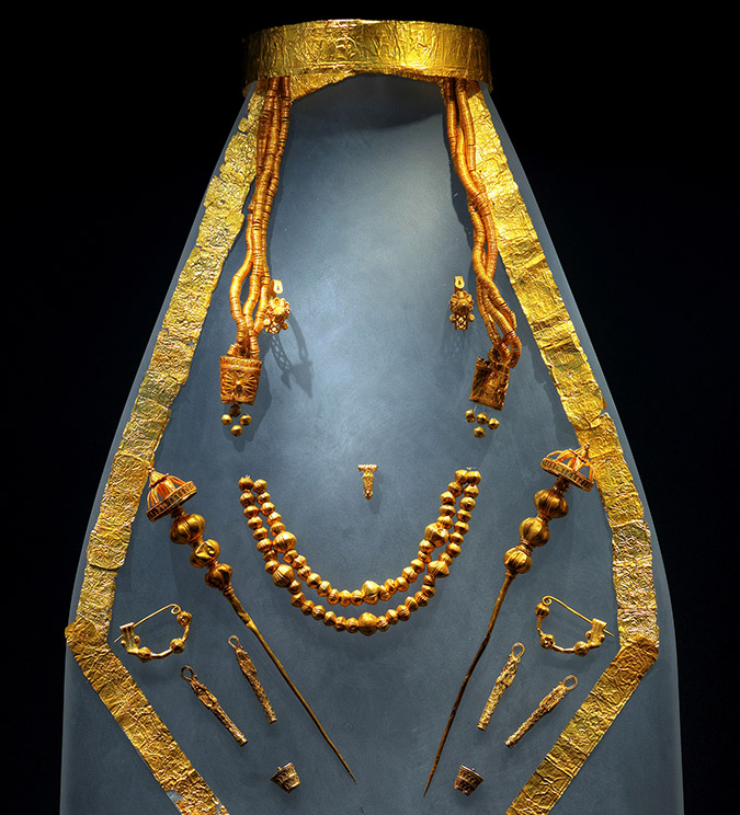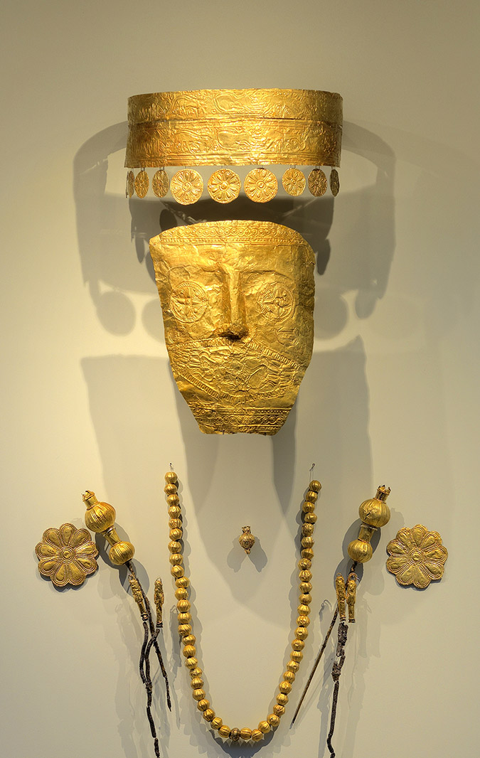 Στοιχείο αναπόσπαστο της βασιλικής εξουσίας, ένδειξη πλούτου και δύναμης, η λάμψη του χρυσού καταυγάζει την έκθεση των «Μακεδονικών θησαυρών». Όμως δίπλα στα κάθε είδους χρυσά κοσμήματα εξ ίσου αν όχι και περισσότερο σημαντικά, βρίσκονται τα αινιγματικά πήλινα κεφάλια δαιμόνων και θεών που χρησιμοποιήθηκαν στις ταφικές τελετές μιας βασίλισσας των Αιγών, εύγλωττοι μάρτυρες της μακεδονικής τέχνης στην αυγή της κλασικής εποχής (480 π.Χ.), αλλά και οι πολυδαίλαδες πανοπλίες, τα περίτεχνα χάλκινα αγγεία και σκεύη, οι λευκές λήκυθοι με την υπέροχη ζωγραφική του 5ου αι. π.Χ., τα μελανόμορφα και ερυθρόμορφα αγγεία, τα μοναδικά αλαβάστρινα και μαρμάρινα σκεύη από τον τάφο της βασίλισσας του Περδίκκα Β΄(454-413 π.Χ.), αλλά και από τον τάφο της βασίλισσας Ευρυδίκης, μητέρας τριών βασιλιάδων και γιαγιάς του Μεγαλέξανδρου, καθώς και τα εξωτικά όσο και πολύτιμα αβγά στρουθοκαμήλου, τα ολόγλυφα μυροδοχεία και τα αντικείμενα από φαγιεντιανή και πολύχρωμο γυαλί.