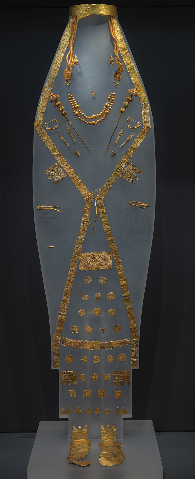 Η περίφημη «Δέσποινα των Αιγών», σύζυγος του Αμύντα Α΄ (530-495 π.Χ.), βασίλισσα και πρωθιέρεια των Μακεδόνων, με το σύνολο των χρυσών κοσμημάτων και των χρυσών ελασμάτων που διακοσμούσαν τη φορεσιά της αποτελεί ένα από τα κεντρικά εκθέματα. Απέναντί της στέκονται οι χρυσοφόροι πολεμιστές του Αρχοντικού με τις εντυπωσιακές πανοπλίες και τις μυστηριώδεις χρυσές νεκρικές μάσκες που φορούν αυτοί και οι γυναίκες τους, μαρτυρίες αδιάψευστες της ηγετικής τους θέσης.