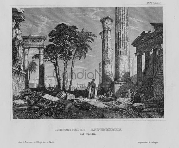 Τα ερωτήματα γίνονται εύλογα από μια εικόνα της Κνωσού που παρουσιάζουμε σήμερα. Πρόκειται για μια χαλκογραφία που δημοσιεύτηκε στα 1850, δηλαδή μισό αιώνα πριν ο Άγγλος αρχαιολόγος εγκατασταθεί στην Κνωσό. Είναι ένα σχέδιο περιηγητή, που είχε επισκεφτεί την εποχή εκείνη το χώρο και μετέφερε, για πρώτη φορά, μια εικόνα των ερειπίων της Κνωσού. Η εικόνα αυτή είχε δημοσιευτεί αρχικά σε γερμανική έκδοση της εποχής και πραγματικά εκπλήσσει με τον τρόπο παρουσιάζει τα ερείπια της Κνωσού. Όσο κι αν δεχτούμε ότι υπάρχουν στο σχέδιο υπερβολές του άγνωστου καλλιτέχνη, δυο στοιχεία μπορεί κανείς να εντοπίσει, χωρίς να χρειάζεται να είναι αρχαιολόγος: