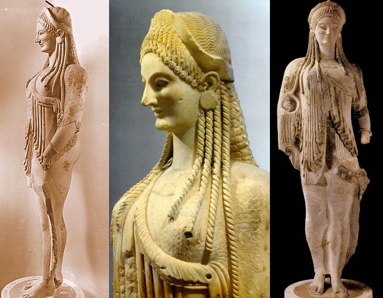 Στις κόρες, λοιπόν, η εξέλιξη της τεχνοτροπίας επικεντρώνεται, κυρίως, στην απόδοση των ενδυμάτων. Τα γυναικεία ενδύματα απαρτίζονται από τρία κομμάτια: χονδρό μάλλινο πέπλο, ιμάτιο από λεπτό λινό και ιμάτιο ως πανωφόρι. Ορθογώνια και τα τρία, χρησιμοποιούντο με ποικίλους τρόπους και στερεώνονταν με κουμπιά και πόρπες, διαμορφώνοντας ενδιαφέρουσες πτυχώσεις. Η προσπάθεια του τεχνίτη να επιτύχει την αρμονική και ισότιμη συζυγία των δύο μελών, του σώματος και του ενδύματος, ήταν μακρόχρονη και επίπονη».