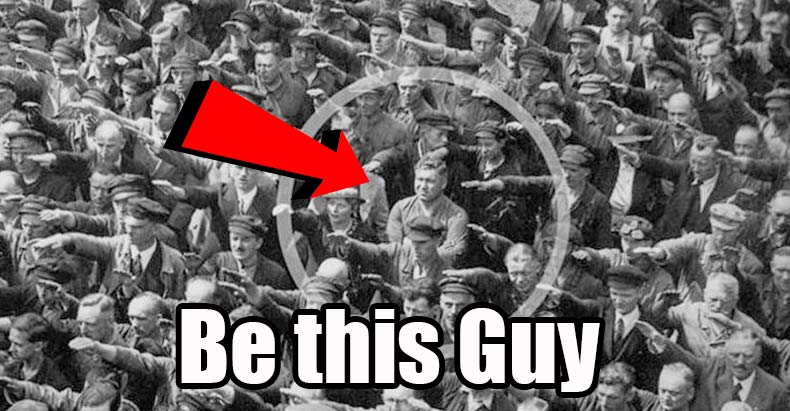 Ο άνδρας πιθανόν ονομάζεται August Landmesser, Ογκιούστ Λαντμέσερ. Μια ημέρα του 1936, στη Γερμανία του Αδόλφου Χίτλερ, αρνείται να χαιρετήσει ναζιστικά, στο μέσον ενός πλήθους ανθρώπων που υψώνουν όλοι μαζί το χέρι για να τιμήσουν την άφιξη ενός νέου πλοίου στο λιμάνι του Αμβούργου. Ηταν 13 Ιουνίου 1936 και όλοι οι εργάτες του ναυπηγείου είχαν αναγκαστεί να παραστούν στην εκδήλωση. Η σκηνή απαθανατίστηκε από έναν άγνωστο φωτογράφο.