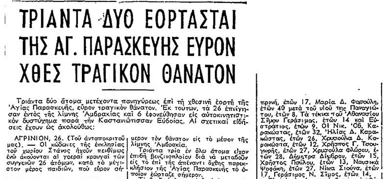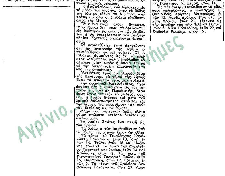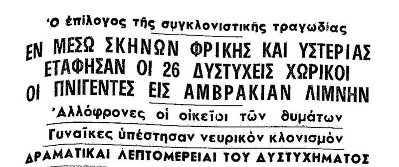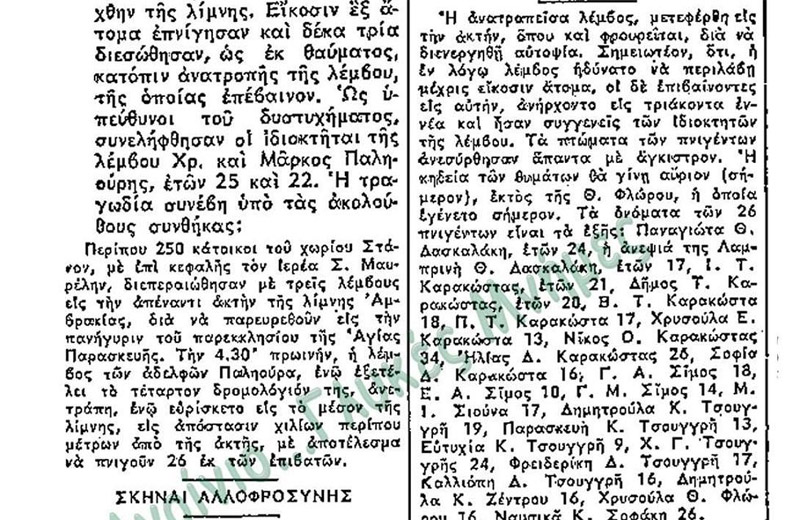 Όταν η βάρκα έφτασε στο μισό της διαδρομής και απείχε περίπου 500 μέτρα από την ακτή, φαίνεται ότι μπήκαν νερά και όσοι βρίσκονταν στην αριστερή πλευρά πανικοβλήθηκαν και μετακινήθηκαν προς τη δεξιά. Αυτό είχε σαν αποτέλεσμα την ανατροπή της λέμβου. 39 άτομα βρέθηκαν ξαφνικά μέσα στο σκοτάδι, στα νερά της λίμνης, μην γνωρίζοντας κολύμπι. Κραυγές απόγνωσης και εκκλήσεις για βοήθεια ακούγονταν… Τη μοιραία βάρκα ακολουθούσε άλλη, ο ιδιοκτήτης της οποίας επέστρεψε όσο πιο γρήγορα μπορούσε στην ακτή για να αποβιβάσει όσους βρίσκονταν στη δική του λέμβο και πήγε ξανά στον τόπο της τραγωδίας. Κατάφερε να σώσει 13 άτομα. Δυστυχώς, 26 άτομα, παιδιά και νέοι άνθρωποι, ηλικίας από 8-42 ετών, έχασαν τη ζωή τους, καθώς βρέθηκαν στον βυθό της Αμβρακίας (σ’ εκείνο το σημείο, το βάθος των νερών είναι περίπου 8 μέτρα). Βλέπετε, το γλυκό νερό της λίμνης τράβηξε προς τα κάτω τα άτυχα θύματα…