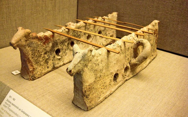 «Ξέρουμε πως είχαν τριποδικές χύτρες -που σημαίνει ότι, αν μη τι άλλο, έβραζαν. Γιαχνί πάντως δεν νομίζω πως έφτιαχναν, αφού δεν είχαν ντομάτες. Σήμερα μπορεί να μιλάμε για τα περίφημα σαντορινιά ντοματάκια, όμως οι ντομάτες μας ήρθαν από την Αμερική! Βρήκαμε επίσης ταψιά και φορητά τριποδικά φουρνάκια: φωτιά από πάνω, φωτιά από κάτω και ταψάκι με καπάκι και πορτούλα. Ενα είδος γάστρας με πόδια». Κρατευτές σουβλακιών