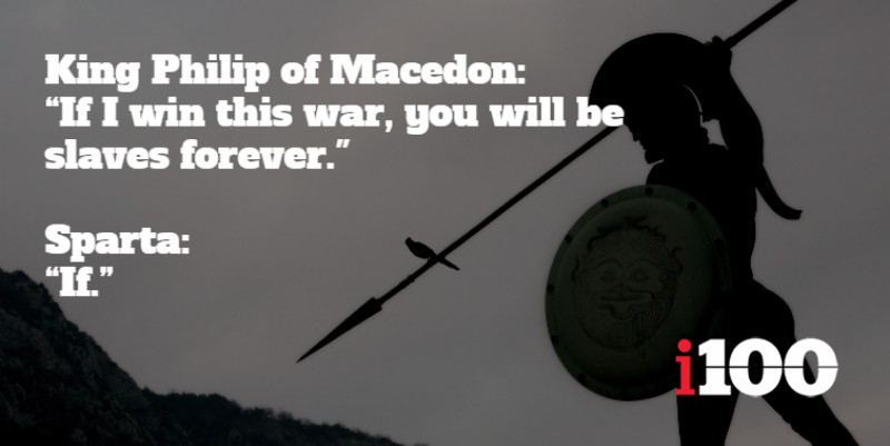 Στην κορυφή των δέκα καλύτερων απαντήσεων φιγουράρουν οι αρχαίοι Σπαρτιάτες, όταν τους απείλησε ο Φίλιππος της Μακεδονίας.