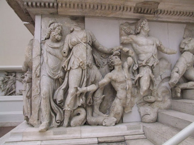 Ο Ωκεανός (στα δεξιά), ο Νηρέας, η Δωρίς και οι άλλοι θεοί μάχονται τους Γίγαντες