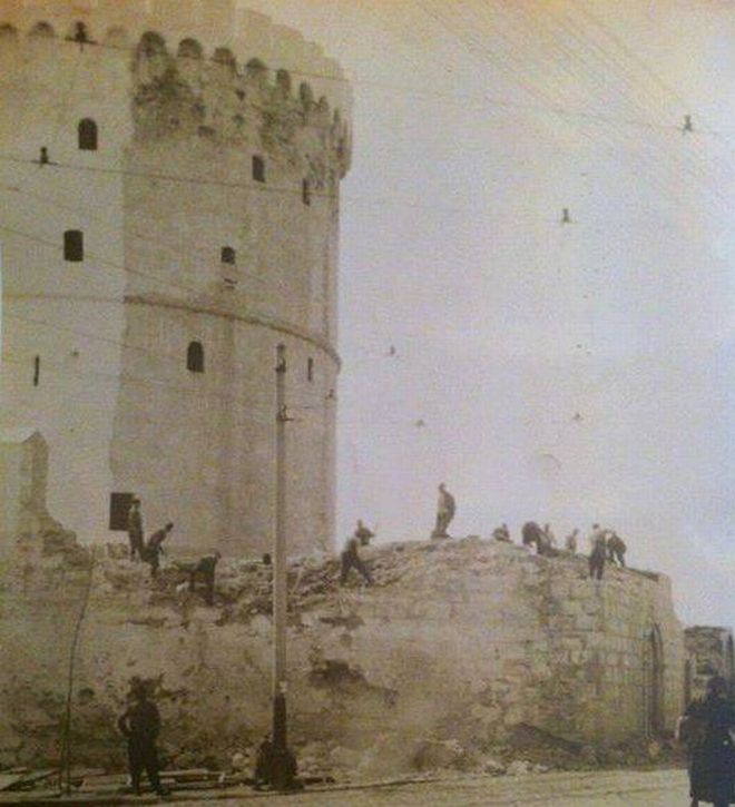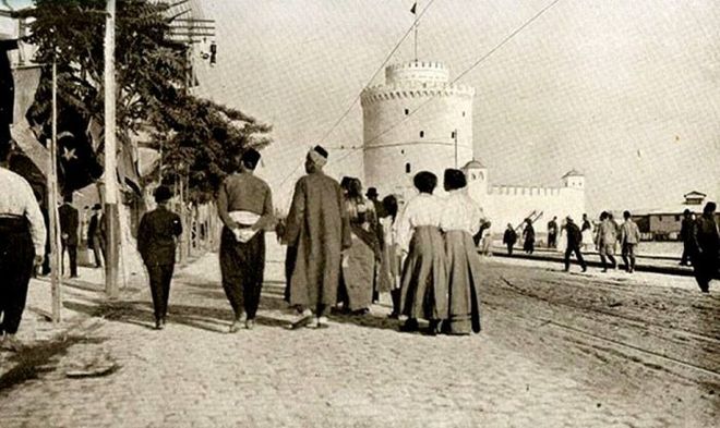 Αυτή η φωτογραφία του 1896 είναι από τις παλαιότερες που δείχνουν τον Λευκό Πύργο με οχύρωση. Προέρχεται από την συλλογή της Wilhelmina von Hallwyl η οποία ταξίδεψε στην Ελλάδα μαζί με τον σύζυγό της Walther von Hallwyl. Μόλις πριν από λίγα χρόνια ένας Εβραίος κατάδικος τον είχε ασβεστώσει για να κερδίσει την ελευθερία του.