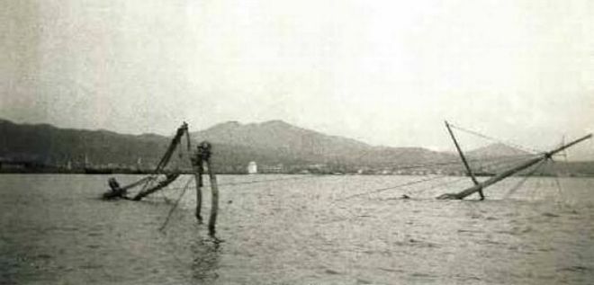 Το λάφυρο από το βυθισμένο τουρκικό θωρηκτό «Φετίχ Μπουλέν», στο οποίο κυματίζει σήμερα στην κορυφή του πύργου η ελληνική σημαία.