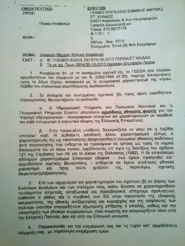 Πιο συγκεκριμένα, σε εμπιστευτικό του έγγραφο αναφέρει «Στην προκειμένη υπόθεση, διευκρινίζεται εκ νέου ότι η Λεβίθα (τα Λέβιθα) αποτελεί νησί. Η αυθαίρετη απόδοση άλλου χαρακτηρισμού (όπως αυτός της ακατοίκητης βραχονησίδας) εγκυμονεί εθνικούς κινδύνους από παρανοήσεις που ενδέχεται να προκύψουν σε τρίτους ως προς τα νομικά δικαιώματα του εν λόγω νησιού, λαμβάνοντας υπ’ όψιν τις διατάξεις του άρθρου 121 της σύμβασης των Η.Ε. για το Δίκαιο της Θάλασσας (1982). Η δε επανάληψη αδόκιμων χαρακτηρισμών Ελληνικών εδαφών -ενώ έχουν προηγηθεί κατ’ αρμοδιότητα σχετικές διευκρινίσεις- ενδέχεται να έχουν συνέπειες εθνικού χαρακτήρα».