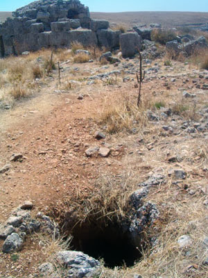 Ένα από τα δεκάδες αρχαία πηγάδια της περιοχής του νεκρομαντείου στο Ταίναρο. Στο βάθος, ο χριστιανικός ναός των Αγίων Ασωμάτων