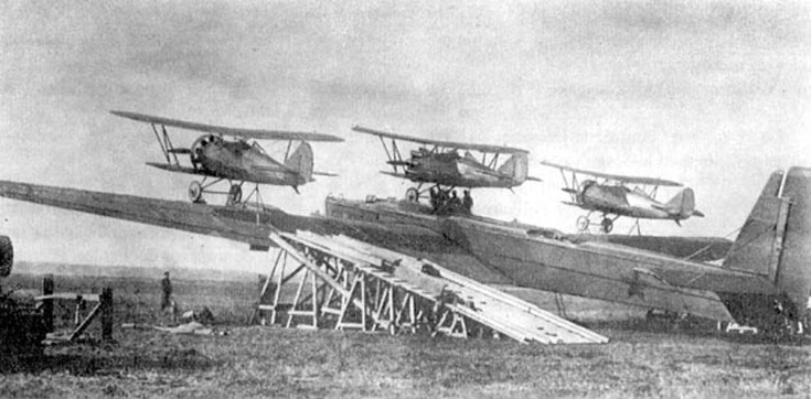 Την ώρα όμως που Άγγλοι και Αμερικανοί τα παρατούσαν, οι Σοβιετικοί μόλις άρχιζαν! Το 1931, ο σοβιετικός αεροναυπηγός Βλαντιμίρ Βακμίστροφ πρότεινε στους επιτελάρχες να μετατρέψει τα θηριώδη βομβαρδιστικά Tupolev σε αεροπλανοφόρα του αέρα, δίνοντας έτσι στα μαχητικά το πλεονέκτημα της μεγαλύτερης ακτίνας δράσης αλλά και των μεγαλύτερων πολεμικών φορτίων. Τα πειράματα του Βακμίστροφ απέδωσαν καρπούς και κάποια στιγμή είχε στα χέρια του ένα βομβαρδιστικό με πέντε μαχητικά προσαρμοσμένα πάνω του!