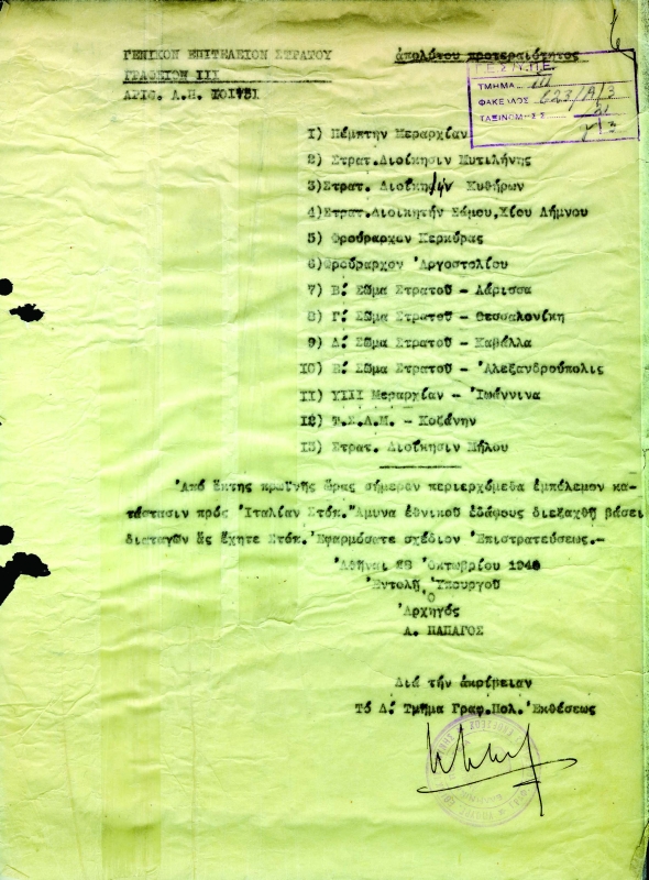 «Ἀπό ἕκτης πρωϊνῆς ὥρας σήμερον περιερχόμεθα εἰς έμπόλεμον κατάστασιν πρὸς Ἰταλίαν. Ἄμυνα ἐθνικοῦ ἐδάφους διεξαχθῇ βάσει διαταγῶν ἅς ἔχετε. Ἐφαρμόσατε σχέδιον Ἐπιστρατεύσως». Ἡ πρώτη διαταγή του Παπάγου. Ἡ λακωνικότητά της αποδείκνυε τὸ μέγεθος τῆς προπαρασκευῆς πού εἶχε πραγματοποιηθεῖ.
