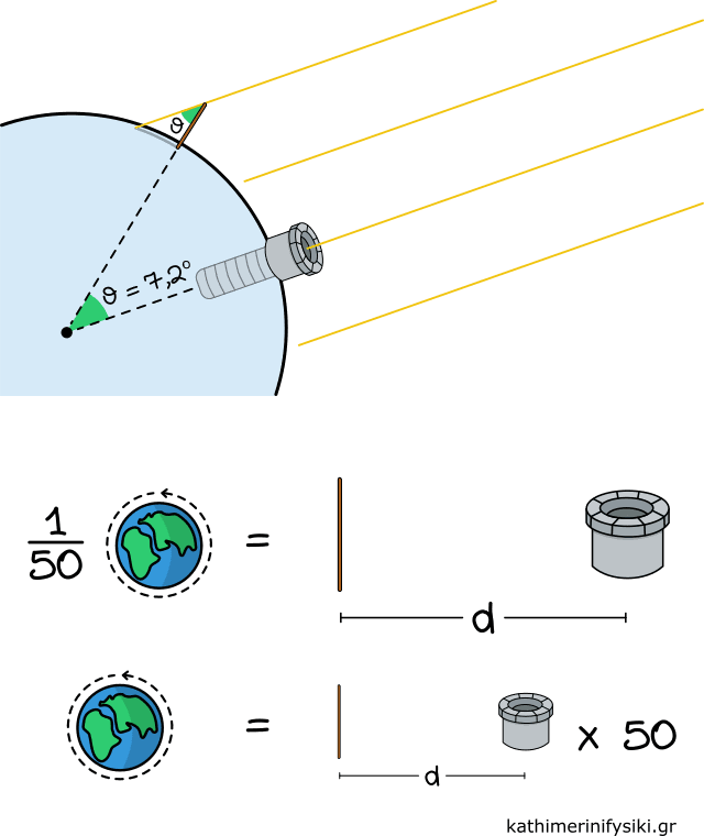 Εφόσον όμως θεώρησε πως η Γη είναι σφαιρική και ο Ήλιος βρίσκεται τόσο μακριά που οι ακτίνες του φτάνουν σ’ αυτή σχεδόν παράλληλες, οι προεκτάσεις του κονταριού στην Αλεξάνδρεια και του πηγαδιού στη Συήνη θα τέμνονται ακριβώς στο κέντρο της Γης, ενώ η γωνία που σχηματίζεται μεταξύ των δύο πόλεων θα είναι ίση με τη γωνία μεταξύ κονταριού και ηλιακών ακτινών, ως εντός εναλλάξ γωνίες!