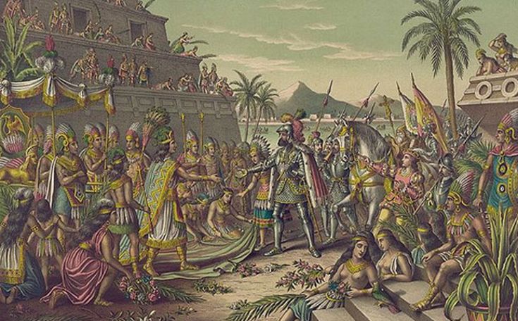 Όταν το 1519, ο Ερνάν Κορτές έφτασε στην πρωτεύουσα των Αζτέκων, Τενοτστιτλάν, ο αυτοκράτορας Μοντεζούμα υποδέχτηκε τον ίδιο και τους άντρες τους με μια μεγάλη τελετή. Οι Αζτέκοι πρόσφεραν στον Κορτές ακόμη και χρυσό και ασήμι, ελπίζοντας ότι αυτοί οι «θεοί» με το λευκό δέρμα θα άφηναν την Τενοτστιτλάν στην ησυχία της.