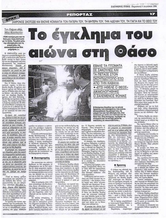 Στις 19 και 20 Μαΐου 1996, ο 24χρονος φοιτητής Νομικής, Θεόφιλος Σεχίδης, σκοτώνει τον πατέρα, τη μητέρα, την αδελφή, το θείο και τη γιαγιά του στον Λιμένα Θάσου. Στη συνέχεια, τεμαχίζει τα πτώματα -εκτός από αυτό του θείου του- και τα μεταφέρει σε σακούλες στη χωματερή της Καβάλας.