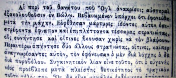 Οι ελληνικές δυνάμεις υποχώρησαν και οι Τούρκοι μπήκαν ξανά στο χωριό, σκοτώνοντας γυναικόπαιδα και λεηλατώντας ότι έβρισκαν μπροστά τους. Η μάχη κράτησε τρεις μέρες. Οι εκπρόσωποι των ξένων δυνάμεων μετέβησαν στο Πήλιο για να ερευνήσουν την κατάσταση και να σταματήσουν τις σφαγές, μέσω συνθηκολόγησης. Έψαξαν τον Ογλ, τον οποίο δεν βρήκαν πουθενά. Ήταν νεκρός. Οι Τούρκοι, που είχαν κρύψει το πτώμα του, είπαν ότι τον δολοφόνησαν οι επαναστάτες. Αργότερα ένας στρατιώτης έδειξε το διαβατήριό του κι ένας άλλος πουλούσε τα ρούχα του.