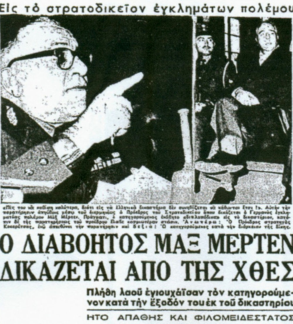 Τελικά η κυβέρνηση υπαναχωρεί. Δεν παίρνει πίσω το νόμο αλλά εξαιρεί τον Μέρτεν από την εφαρμογή του. Έτσι στις 11 Φεβρουαρίου του 1959 αρχίζει η δίκη στο Ειδικό Στρατοδικείο Εγκληματιών Πολέμου της Αθήνας. Στις 5 Μαρτίου εκδίδεται η απόφαση του Στρατοδικείου σύμφωνα με την οποία ο Μέρτεν καταδικάζεται σε ποινή φυλάκισης 25 ετών κατά συγχώνευση.