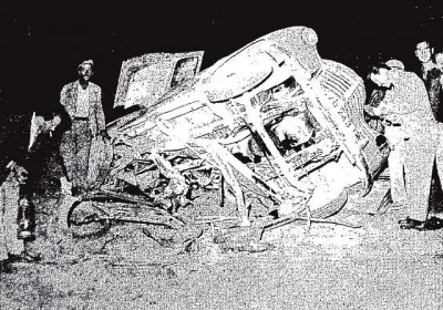 Σκόνη και μαύρος καπνός γέμισαν τον ουρανό. Το αυτοκίνητο είχε πατήσει τη νάρκη. Φωτογραφία από τον τόπο του ατυχήματος που δημοσιεύτηκε σε εφημερίδα της εποχής Φωτογραφία από τον τόπο του δυστυχήματος, που δημοσιεύτηκε σε εφημερίδα της εποχής.