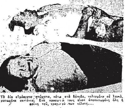 «Αυτό που είδαμε, ήταν τραγικό. Μια τεράστια λακκούβα είχε ανοιχθεί στο χώμα, ενώ το αυτοκίνητο ήταν εκσφενδονισμένο πολλά μέτρα πιο ‘κει, κάπνιζε και είχε καταστραφεί τελείως. Ο σοφέρ ήταν πεσμένος κάτω και βογκούσε. Κάτω από τα συντρίμμια του πίσω μέρους, ανάμεσα σε ένα σπασμένο φτερό και μια ρόδα, ήταν ένα ανδρικό πόδι, κομμένο από το γόνατο και γεμάτο αίματα. Πιο κει, σε απόσταση 15 μέτρων, ήταν πεσμένη η γυναίκα. Είχε γείρει πλάγια. Το κεφάλι της ήταν γεμάτο αίματα και κατάμαυρο από τα αέρια. Το αριστερό της πόδι ήταν τελείως σπασμένο. Ήταν νεκρή. Αρκετά μέτρα πιο κάτω ήταν ο άνδρας. Είχε πέσει μπρούμυτα. Το αριστερό πόδι και το αριστερό χέρι του έλειπαν. Κάποιος έψαχνε πιο ‘κει. Ήρθε κοντά μας κρατώντας κάτι. Νόμιζα πως ήταν ένα κίτρινο γάντι. Ύστερα κατάλαβα ότι ήταν το χέρι που έλειπε. Ήταν κάτι που δε θα το ξεχάσω ποτέ».
