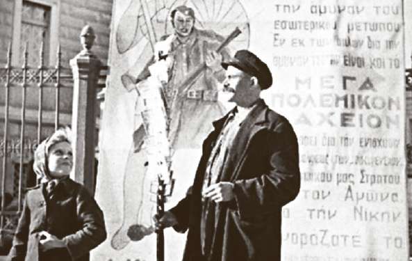Λαχειοπώλης, το 1940, έχοντας πίσω του διαφήμιση από το Μέγα Πολεμικόν Λαχείον που συνετέλεσε στη χρηματοδότηση του ελληνοϊταλικού πολέμου