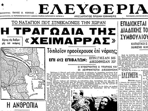 Στη 1 τα ξημερώματα της Κυριακής φθάσαμε στη Χαλκίδα και σε λίγο το “Χειμάρρα” απέπλευσε. Μετά από λίγες ώρες το πλοίο συγκλονίστηκε από μια τρομερή έκρηξη. Επακολούθησε πανικός. Δε λειτουργούσε τίποτε. Επικράτησε απόλυτο σκοτάδι. Το “Χειμάρρα” ήταν ακυβέρνητο. Όλοι οι πολιτικοί εξόριστοι είχαμε συγκεντρωθεί στο κατάστρωμα. Ένας σύντροφός μου, ο Αριστείδης, είχε μία λάμπα θυέλλης και την άναψε. Ο Παναγιώτης ο Τάρπογλου έρχεται και μας λέει ότι τα αμπάρια γεμίσανε νερό. Από ένα κιβώτιο παίρνουμε σωσίβια. Βγάζω τα ρούχα μου, το φοράω και ζητάω από τους άλλους συγκρατούμενούς μου να κάνουν το ίδιο.