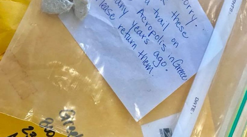 Το μικρό δεματάκι περιείχε ένα σακουλάκι με τέσσερις πετρούλες και ένα πολύ σύντομο σημείωμα: «Λυπάμαι. Τις πήρα αυτές από ένα μονοπάτι στην Ακρόπολη της Ελλάδας, πολλά χρόνια πριν. Παρακαλώ να τις επιστρέψετε».