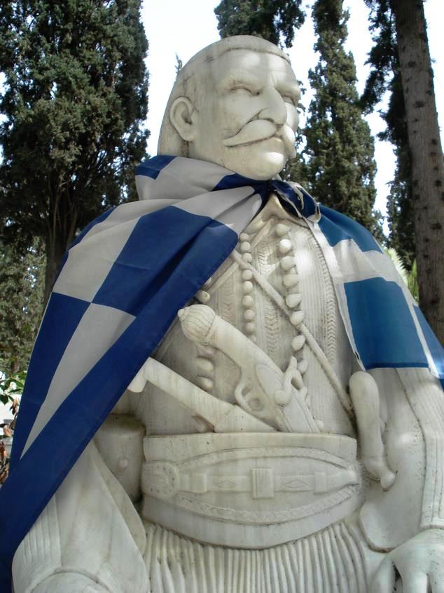 Στα πόδια του τοποθέτησαν μια Τούρκικη σημαία, λάφυρο της Εθνεγερσίας ενώ τον ίδιο τον σκέπασαν με τη Γαλανόλευκη.