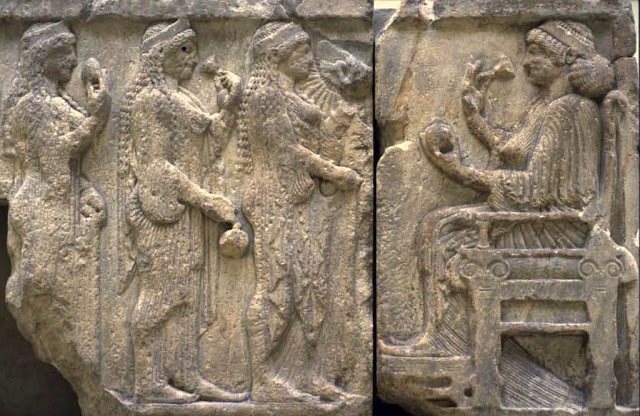 Ο Μεγάλος ναός της Άρτεμης στην Έφεσο Κάτω το τύμπανο της βάσης ,παριστά τον Θάνατο το Ερμή ψυχοπομπό την Περσεφόνη τον Πλούτωνα και πιθανά την Άλκηστη ή την Ευρυδίκη κίονα -Βρετ .Μουσείο.