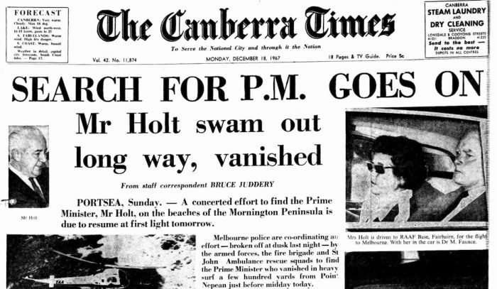 Ο πρωθυπουργός της Αυστραλίας, Χάρολντ Χολτ, έχοντας ταξιδέψει μέχρι το εξοχικό του σπίτι για το Σαββατοκύριακο, εξαφανίζεται μυστηριωδώς κατά τη διάρκεια ενός χειμερινού του μπάνιου κοντά στην πόλη Portsea της Βικτώρια, 60 χιλιόμετρα νοτιοανατολικά της Μελβούρνης.