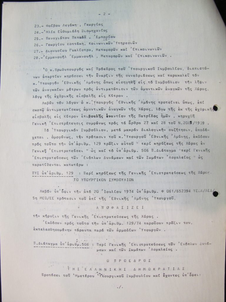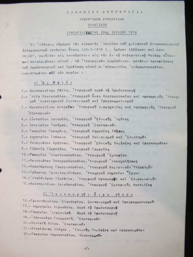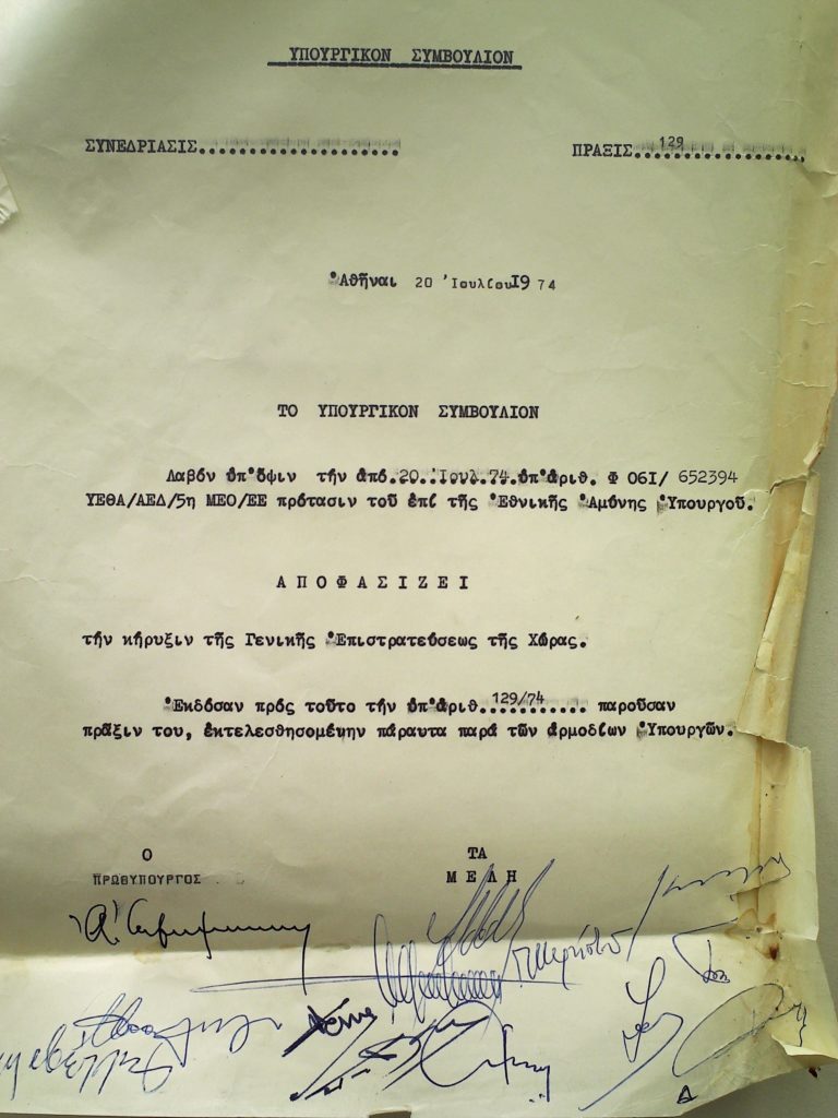 3) Πρακτικά συνεδρίασης του Υπουργικού Συμβουλίου της 20ης Ιουλίου 1974 υπό τον Πρωθυπουργό Αδαμάντιο Ανδρουτσόπουλο, όπου αποφασίζεται η κήρυξη «της Γενικής Επιστρατεύσεως της χώρας» και Πράξη Υπουργικού Συμβουλίου με τις υπογραφές των συμμετεχόντων στο Υπουργικό Συμβούλιο