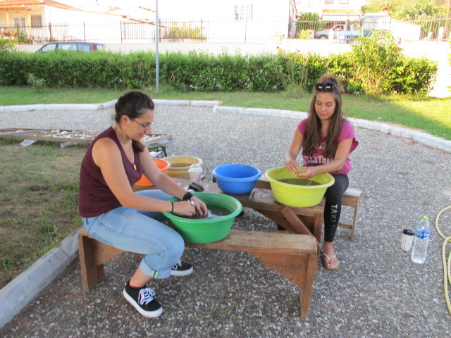 Οι φοιτήτριες Αρχαιολογίας Μαρία Μιχελάκη και Παναγιώτα Μανταβάνου εργάζονται για την προετοιμασία των αρχαίων οστρέων από τον αρχαιολογικό χώρο των Αβδήρων.