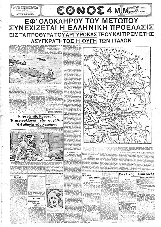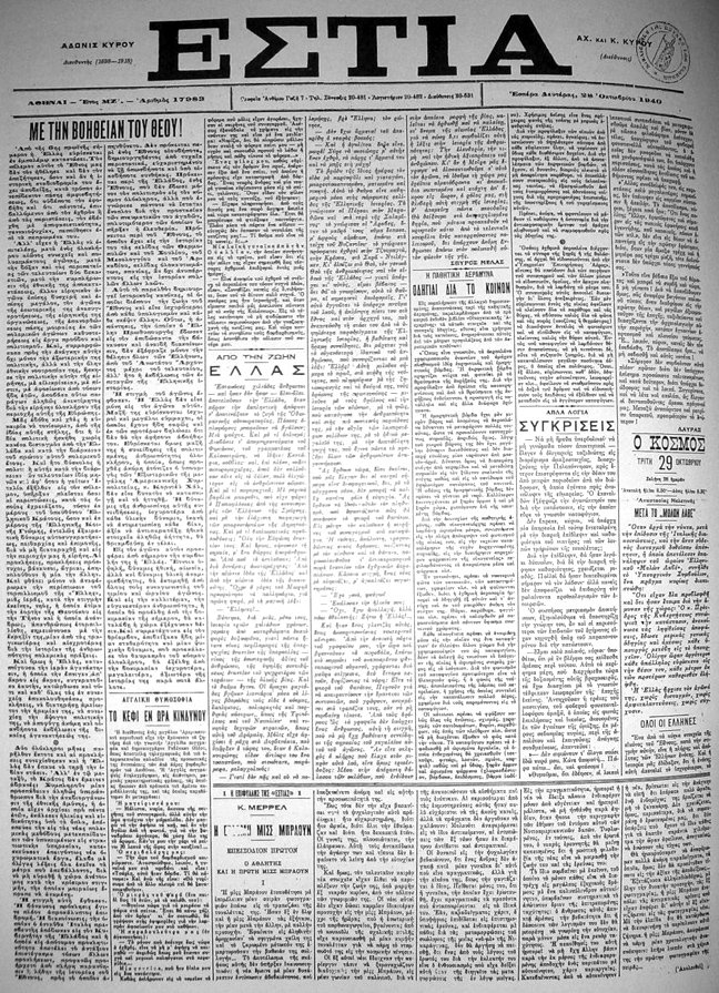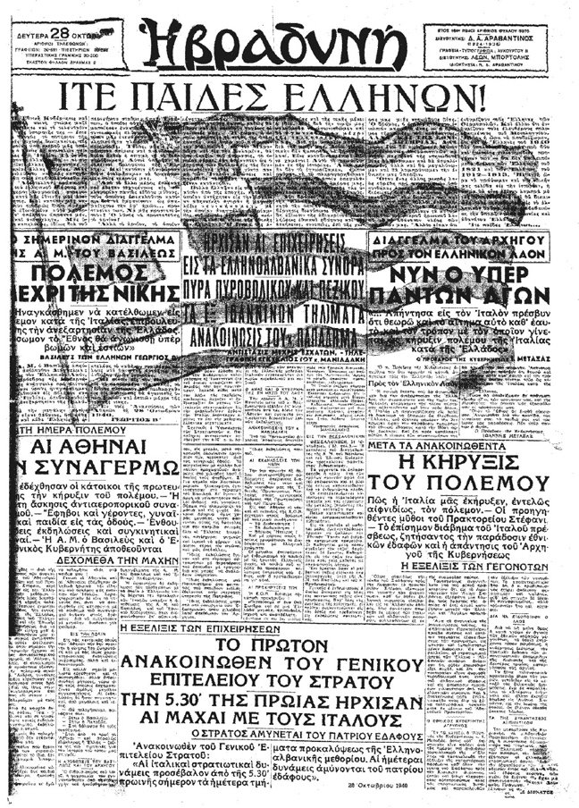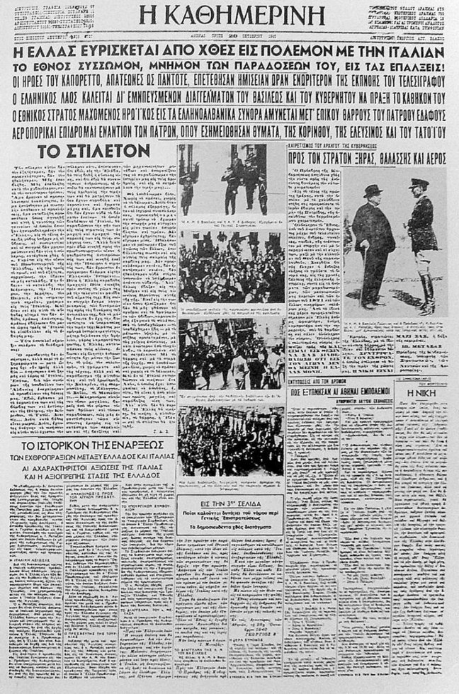 «Η Ελλάς ευρίσκεται από χθες εις πόλεμον με την Ιταλία», είναι ο τίτλος του βασικού θέματος της εφημερίδας «ΚΑΘΗΜΕΡΙΝΗ» στις 28 Οκτωβρίου 1940